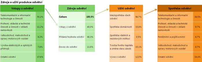 Následující schéma ukazuje, jaká je struktura zdrojů a užití v tomto odvětví. Na jedné straně jde o zdroje využité v odvětví - jedná se buď o spotřebované vstupy z jiných odvětví ekonomiky ČR (nebo ze stejného odvětví, avšak od jiných ekonomických subjektů), případně o vlastní výrobu (přidaná hodnota odvětví) nebo o vstupy ze zahraničí (dovoz). Druhá část schématu potom naopak ukazuje, kde jsou výstupy (produkty a služby) tohoto odvětví využívány. Výstupy z tohoto odvětví mohou sloužit buď jako vstup (zdroje) pro jiná odvětví, nebo mohou být spotřebovány (koupeny) domácnostmi či vládou nebo neziskovými institucemi. Další možností je, že výstupy tohoto odvětví poslouží pro tvorbu fixního kapitálu či zůstanou uloženy ve formě zásob. Poslední možností je, že výstupy tohoto odvětví budou spotřebovány v cizině (vývoz).
