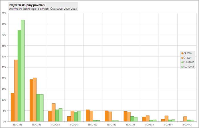V odvětví Telekomunikační a informační technologie a činnosti byly v ČR v roce 2014 tři skupiny povolání, které měly na celkovém počtu zaměstnaných v tomto odvětví podíl alespoň 5 %. Největší skupinou povolání jsou Analytici a vývojáři softwaru a počítačových aplikací (ISCO 251), kteří mají na zaměstnaných osobách v tomto odvětví podíl zhruba 28 %. Koncentrace povolání je v tomto odvětví vysoká. Porovnání podílu největších skupin povolání v tomto odvětví v ČR a v EU28 ukazuje následující graf.