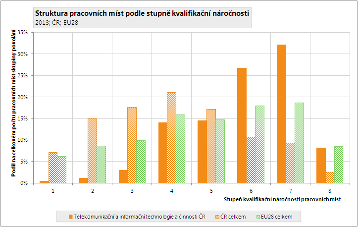 Kvalifikační náročnost pracovních míst je ukazatel, zahrnující v sobě nejen vzdělání potřebné pro dané pracovní místo, ale i další zapracování v podobě praxe. Čím vyšší stupeň, tím vyšší kvalifikační nároky jsou pro dané pracovní místo požadovány. Celková úroveň kvalifikační náročnosti (požadavků) pracovních míst v odvětví Telekomunikační a informační technologie a činnosti činila v roce 2013 v ČR 5,91 bodu (na osmistupňové škále). To je o 1,83 bodu více, než je kvalifikační náročnost všech pracovních míst v celé ČR. V EU28 činila v roce 2013 úroveň kvalifikačních požadavků pracovních míst v tomto odvětví 5,24 bodu, byla tedy o 0,66 bodu nižší, než kvalifikační náročnost pracovních míst v tomto odvětví v ČR. V porovnání se všemi pracovními místy v EU28 je kvalifikační náročnost pracovních míst odvětví Telekomunikační a informační technologie a činnosti vyšší, než je kvalifikační náročnost pracovních míst v celé EU28 a to o 0,29 bodu.