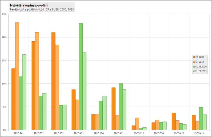 V odvětví Peněžnictví a pojišťovnictví byly v ČR v roce 2014 čtyři skupiny povolání, které měly na celkovém počtu zaměstnaných v tomto odvětví podíl alespoň 5 %. Největší skupinou povolání jsou Specialisté v oblasti financí (ISCO 241), která má na zaměstnaných osobách v tomto odvětví podíl zhruba 23 %. Koncentrace povolání je v tomto odvětví vysoká. Porovnání podílu největších skupin povolání v tomto odvětví v ČR a v EU28 ukazuje následující graf.