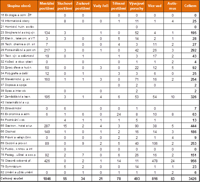 Struktura žáků se zdravotním postižením je z hlediska zastoupení žáků v jednotlivých kategoriích i oborech vzdělání odlišná. Tato stránka uvádí obory, ve kterých se tito žáci vzdělávají, a to v rozdělení podle druhu zdravotního postižení a oborů (skupin oborů).