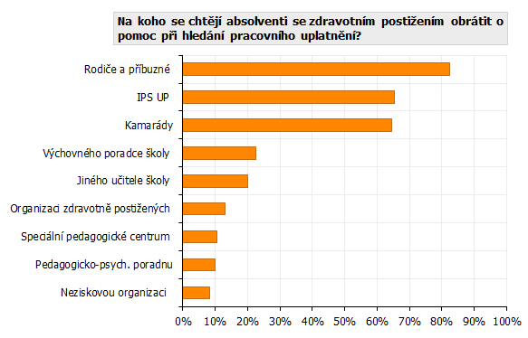 Podobně jako u běžné populace chce většina absolventů se zdravotním postižením při hledání pracovního uplatnění využít především pomoci rodičů a příbuzných (82,4 %) a dále kamarádů (64,5 %).